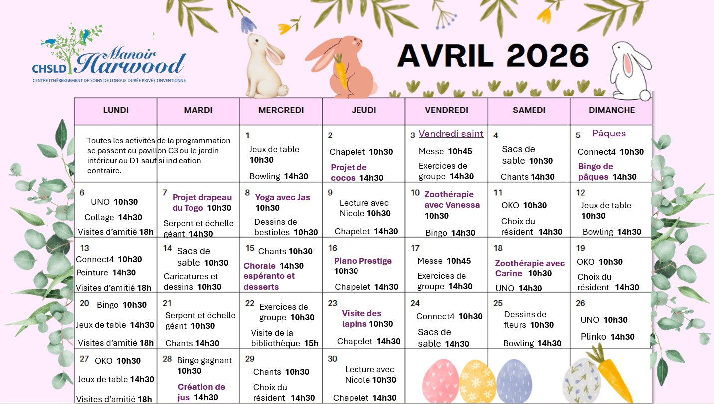 Si vous souhaitez plus d’information, n’hésitez pas à communiquer avec Angélique Larose : angelique@chsldmanoirharwood.com